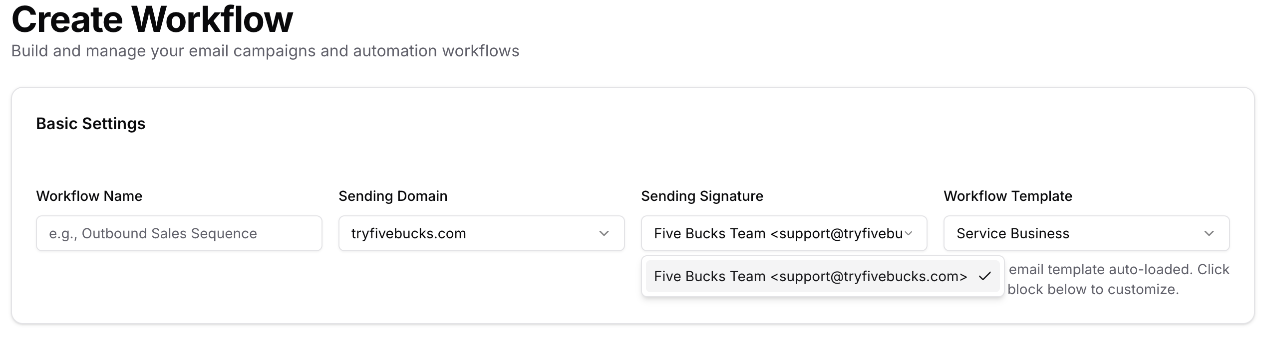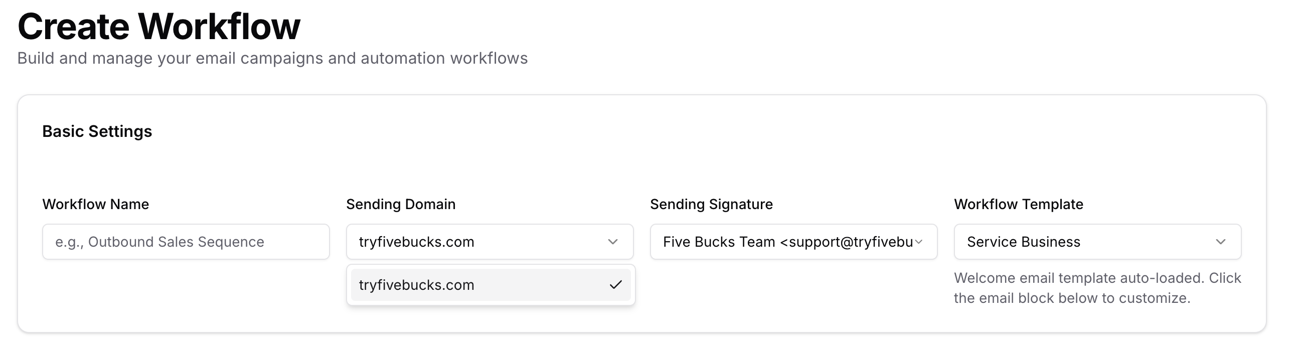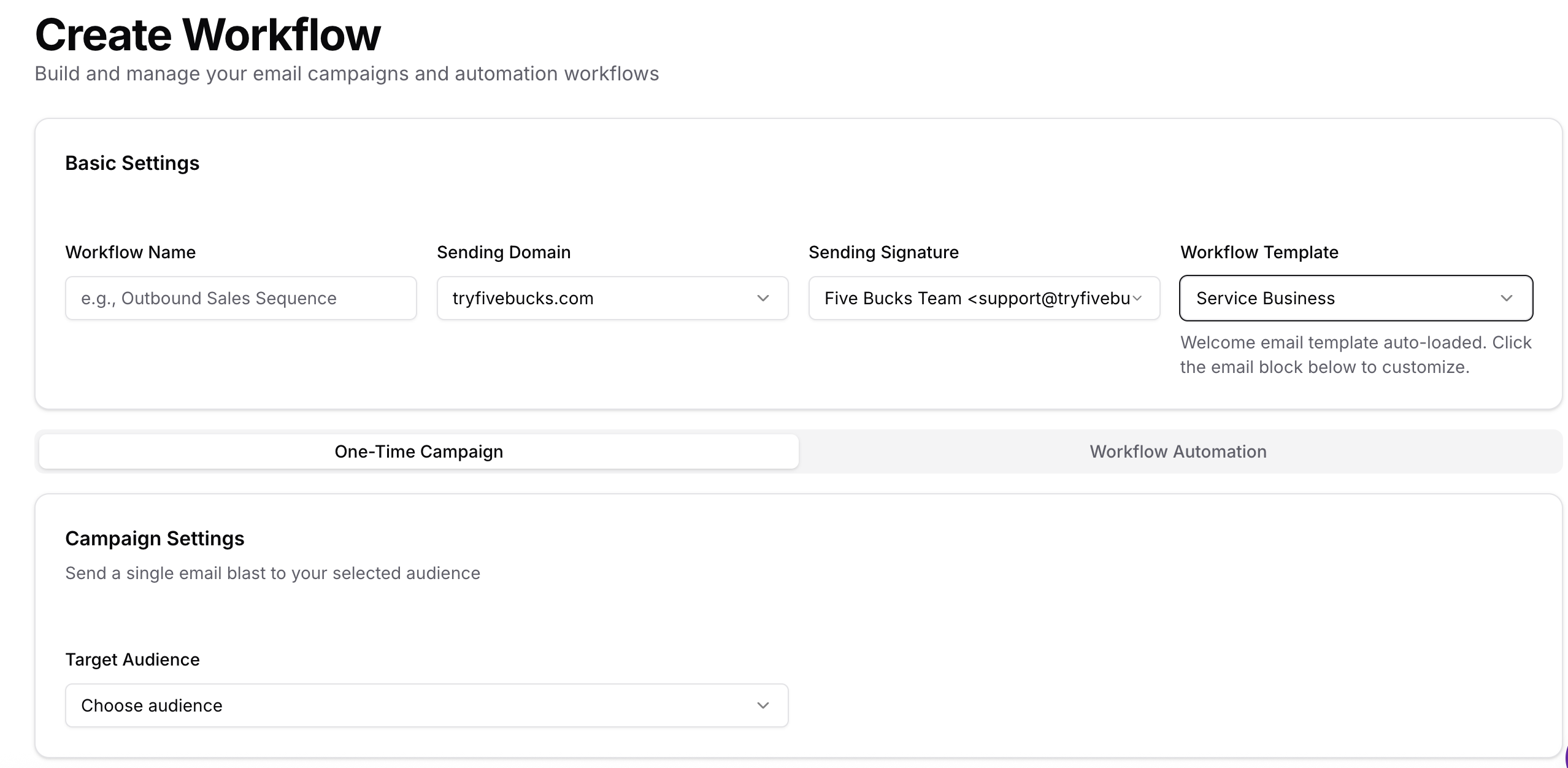 Choose the tab that matches what you want, then fill in basic settings (name, domain, signature, optional template) and the section below for that tab (audience and, for workflows, schedule).
