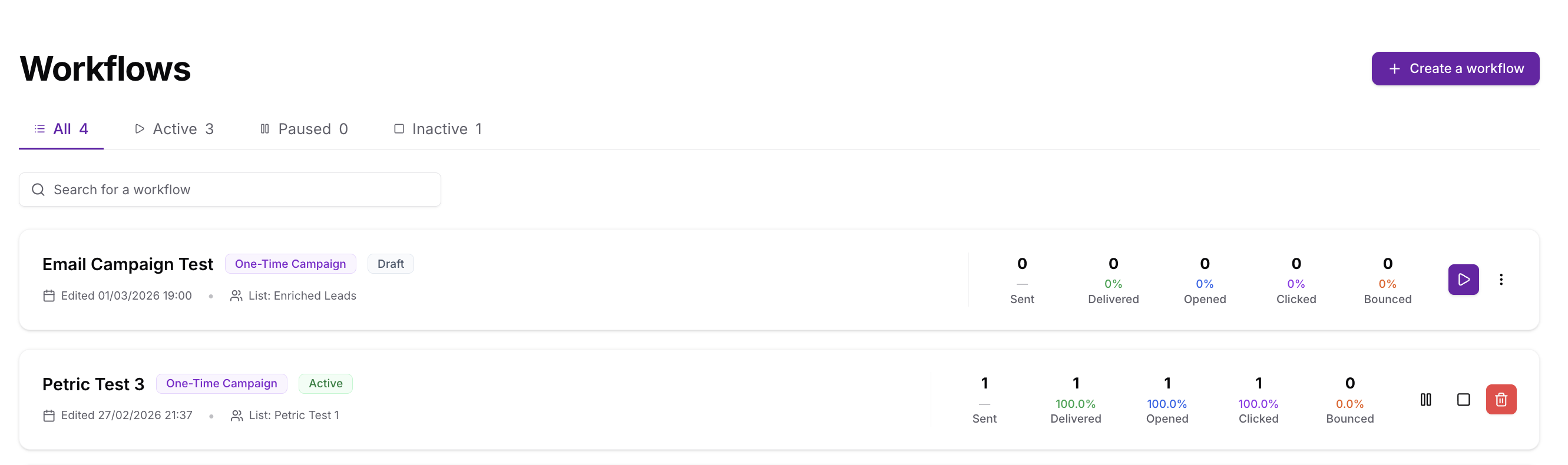 You will see your list of workflows—both one-time campaigns and workflow automations—with status (Active/Paused/Inactive) and stats (sent, opened, clicked).